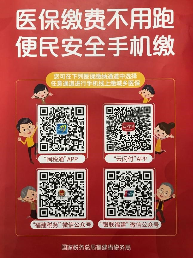 2019年4月起,参保居民可以通过闽税通APP、云闪付APP、“福建税务”公众微信号、自助办税终端办理缴费手续。