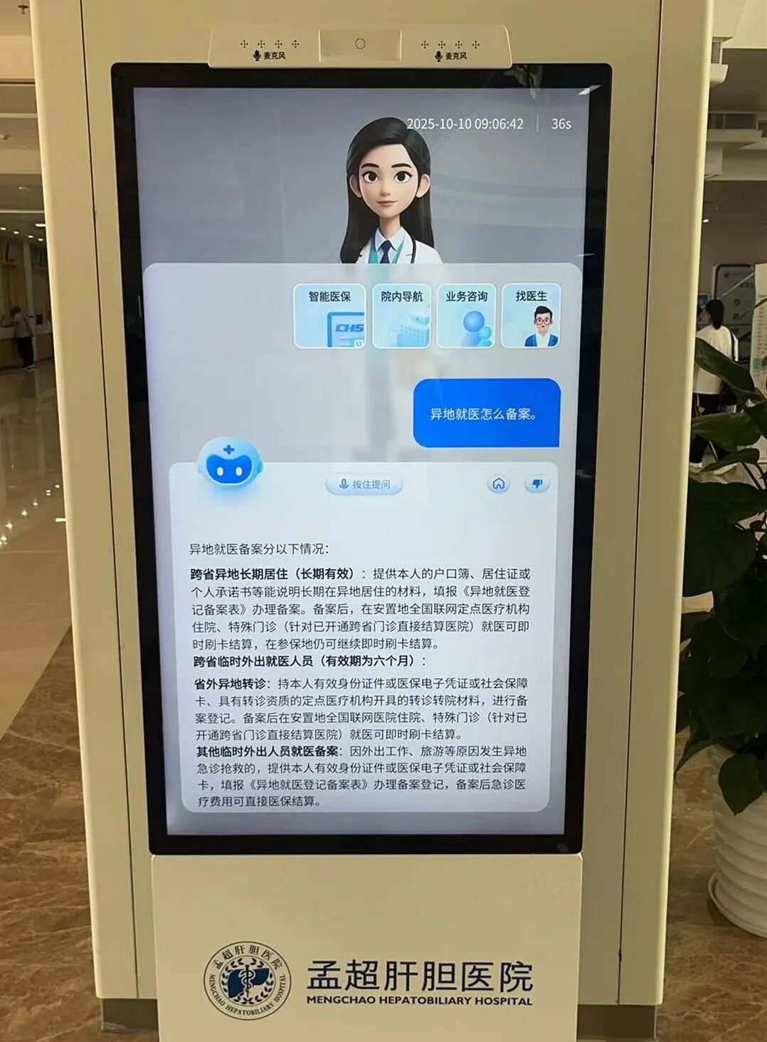 刚做完检查的林先生试着问:“异地就医怎么备案?”数字人立刻清晰作答,还调出操作流程。