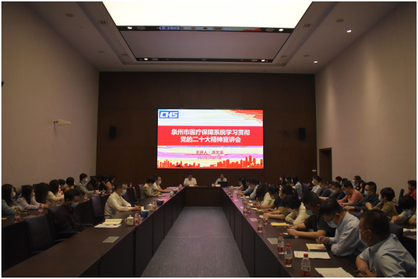 宣讲会采用视频连线的方式举行。泉州市医保局机关、市医保中心全体党员干部职工在主会场参会,各县(市、区)医保分局、分中心全体党员干部职工在分会场参加会议。