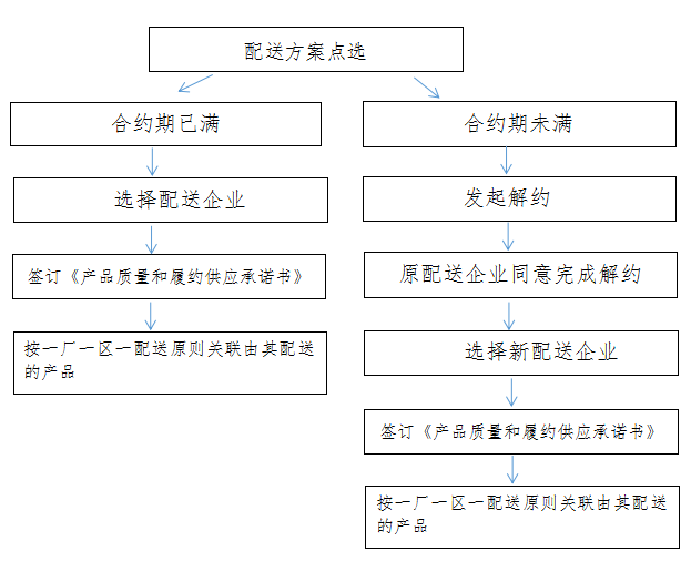 申报企业需符合一厂一区一配送原则,由生产企业提交各片区配送变更方案申请,协议期内需由原配送、新配送三方签订配送变更确认协议后予以变更,变更后的配送信息平台即时同步交易。协议期满后申报企业可直接与原配送解约,重新确认配送企业并签订协议。