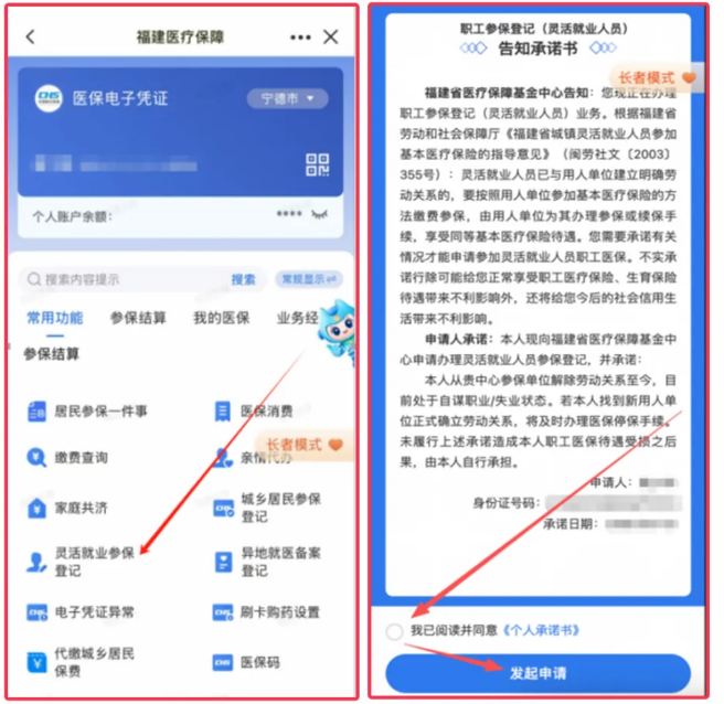 1.在闽政通APP首页点击【医保服务】进入对应页面,在参保结算栏目中点击【灵活就业参保登记】,按系统要求填写相关个人信息,阅读并同意书“告知承诺书进入办理页”。