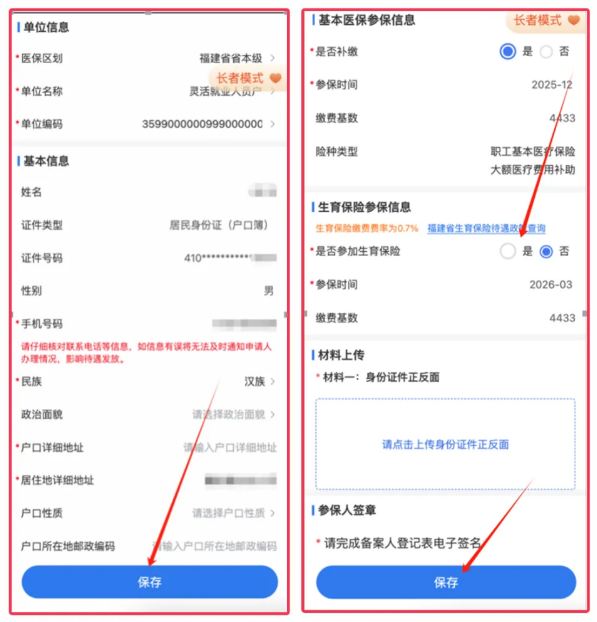2.进入灵活就业参保登记页后,确认信息是否与本人一致填写申请信息,选择需要参保统筹区,未参加生育险的灵活就业参保人,可选择是否参加生育保险(生育险参保时间默认申请当月),且上传相关认定材料,点击保存。