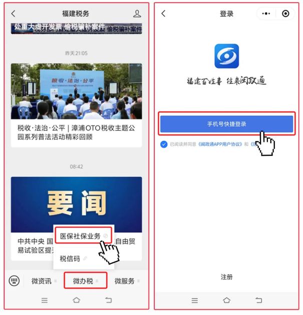 1.微信搜索并关注“福建税务公众号,点击菜单栏【微办税】-【医保社保业务】,登登录闽政通账号完成实名认证。