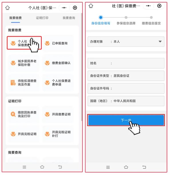 2.点击【个人社(医)保缴费办理】,进入【个人信息填写】界面,按要求填写姓名身份证件号码等相关信息后,点击【下一步】。