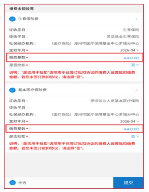 3.在“参保信息选择界面,勾选险种为基本医疗保险费、生育保险费,确认缴费基数后点击【下一步】,进入“缴费信息提交”与界面选择【日常缴费】。注意选择页面上方的费款所属期,若缴费信息无误,点击【提交】进行缴费即可。