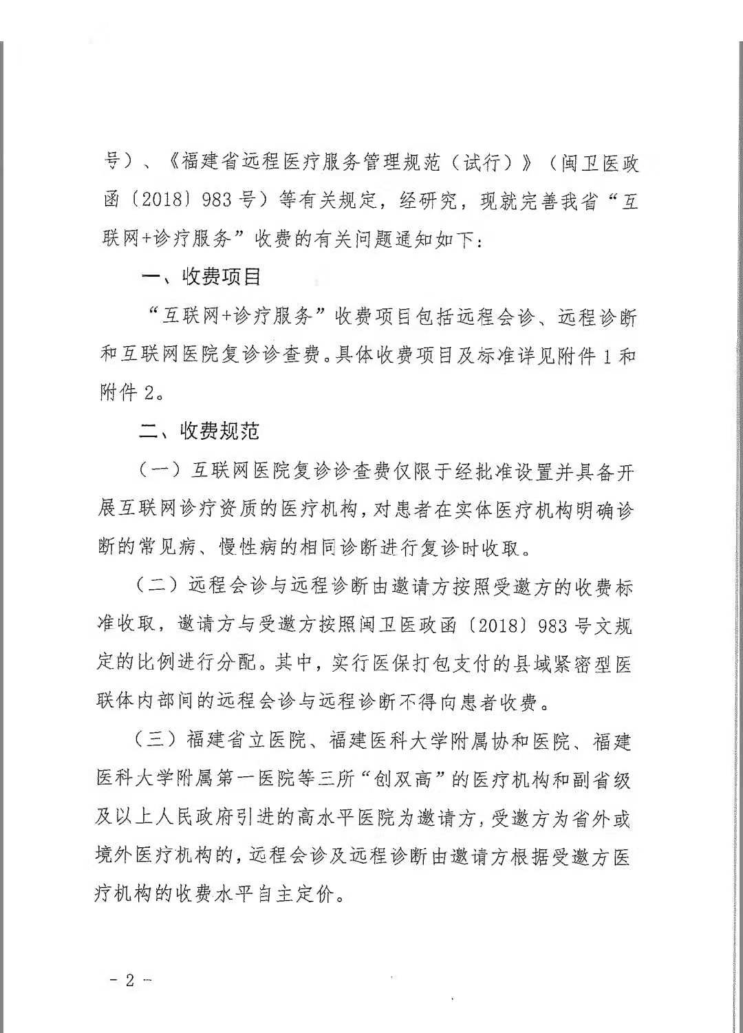 - 内容概述:为进一步优化医疗资源配置,创新医疗服务模式,促进我省“互联网+诊疗服务”健康发展,根据国务院办公厅《关于促进“互联网+医疗健康”发展的意见》(国办发〔2018〕26号)、《福建省远程医疗服务管理规范(试行)》(闽卫医政函〔2018〕983号)等有关规定,经研究,现就完善我省“互联网+诊疗服务”收费的有关问题通知