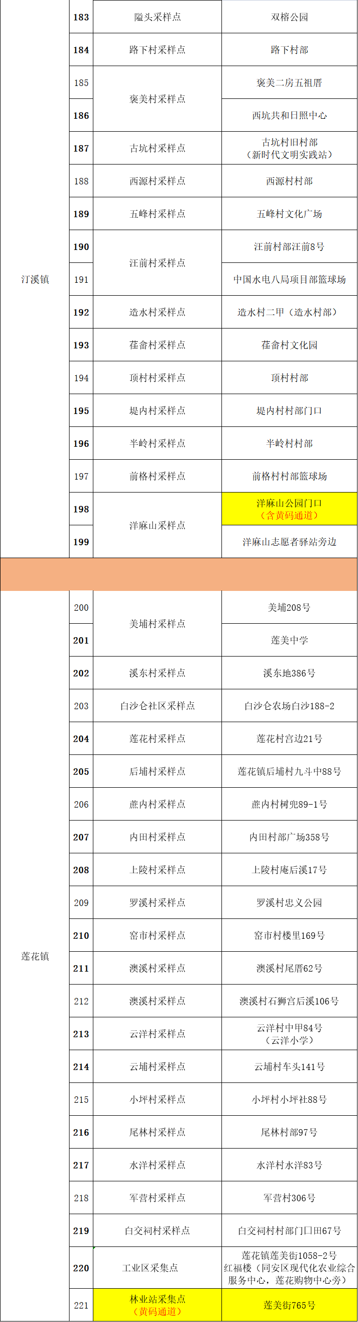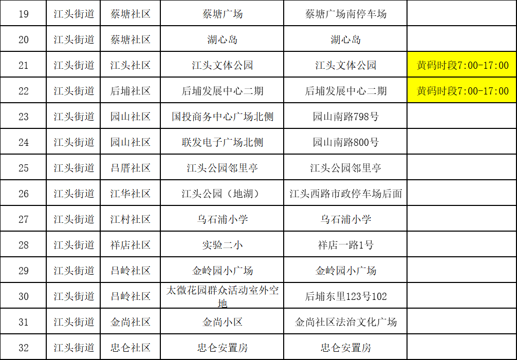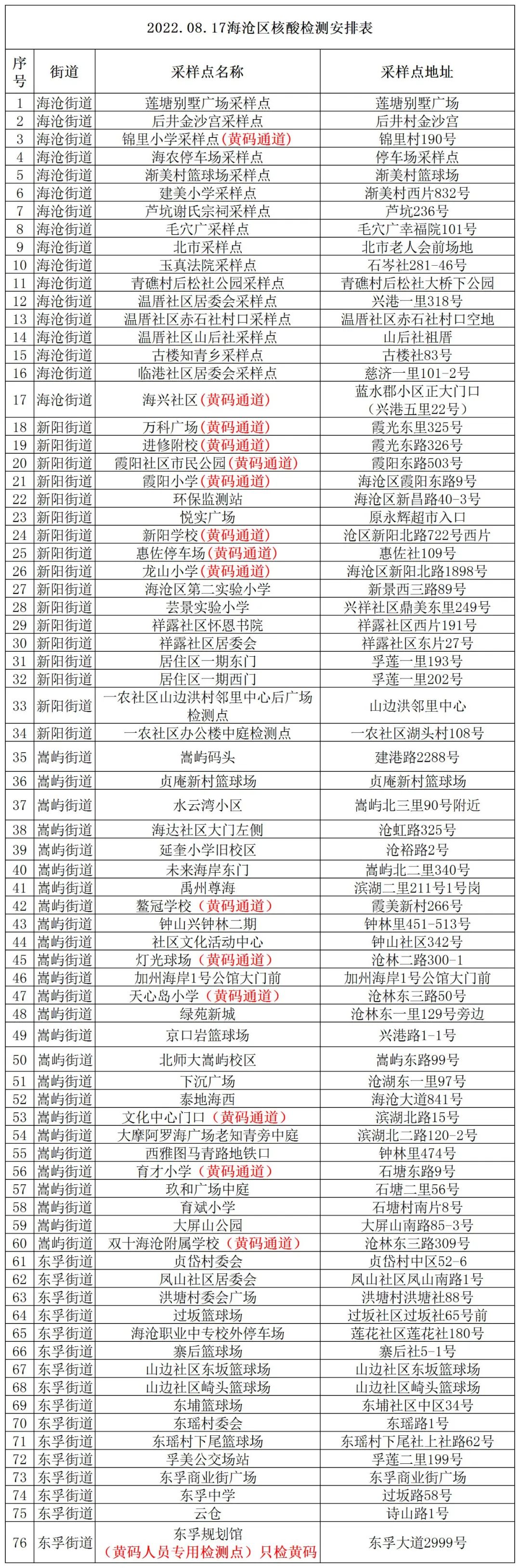 | 街道 | 采样点 | 具体地址 | 是否设黄码通道 |