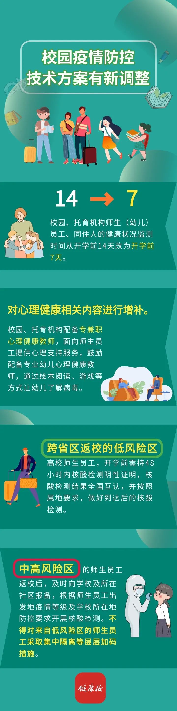 3个新版方案都要求各地教育行政部门会同卫生健康、疾控等部门加强对校园、托育机构疫情防控工作的督导检查,认真排查辖区内学校疫情防控措施落实情况,对检查中发现的问题立行立改,及时跟踪整改到位;并将对师生(幼儿)员工、同住人的健康状况监测时间从开学前14天改为开学前7天;对心理健康相关内容进行增补,高等院校、中小学校新版防控方案均强调,要配备专兼职心理健康教师,面向师生员工提供心理支持服务,托育机构新版方案也新增关注情绪变化内容,并鼓励配备专业幼儿心理健康教师,通过绘本阅读、游戏等方式让幼儿了解病毒。