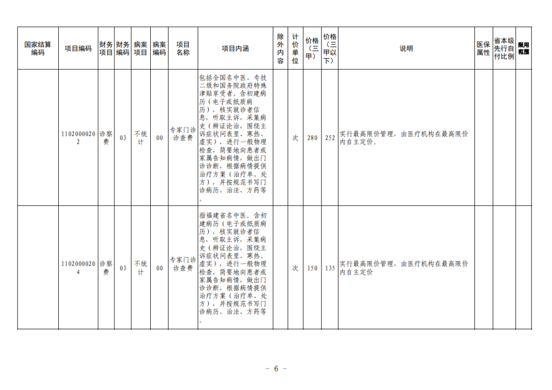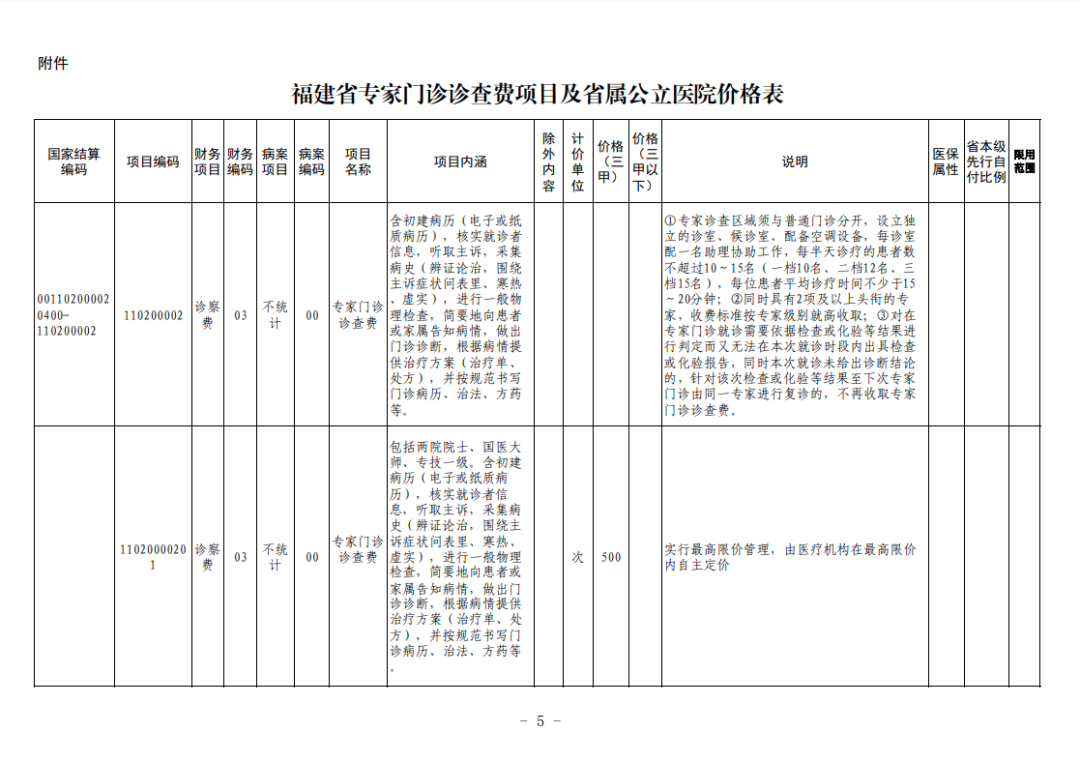 福建省专家门诊诊查费项目及省属公立医院价格表