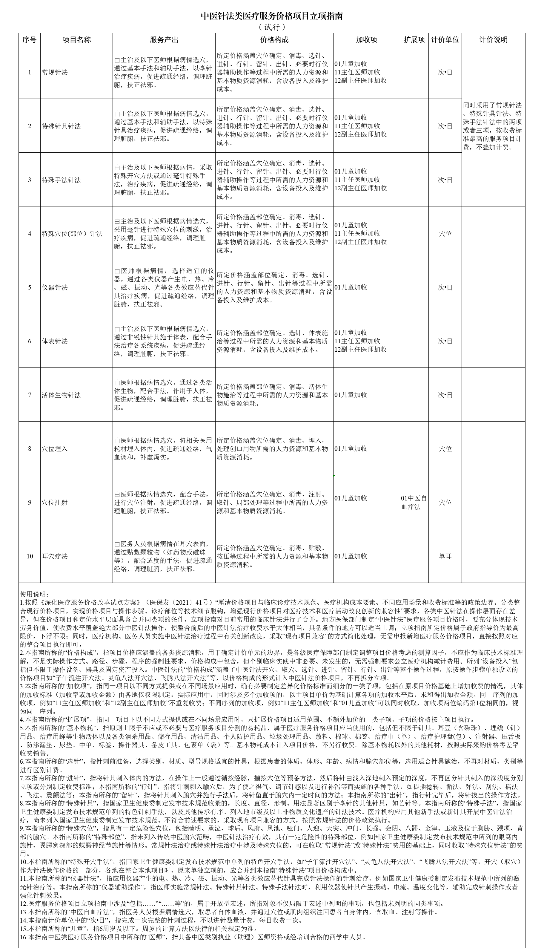 说明:为贯彻落实《深化医疗服务价格改革试点方案》,推进全国医疗服务价格项目规范编制工作,按照“成熟一批、发布一批”的工作思路,国家医保局组织编制了《中医针法类医疗服务价格项目立项指南(试行)》,参考2023年版医疗服务项目技术规范,将现行中医针法类价格项目映射整合为10项。