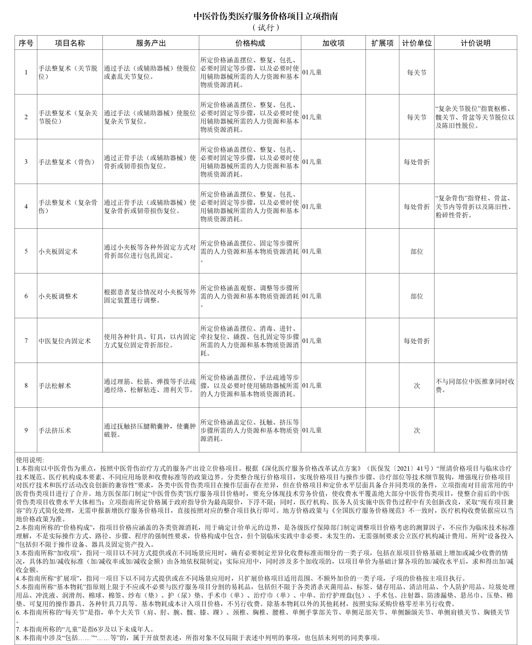 说明:为贯彻落实《深化医疗服务价格改革试点方案》,推进全国医疗服务价格项目规范编制工作,按照“成熟一批、发布一批”的工作思路,国家医保局组织编制了《中医骨伤类医疗服务价格项目立项指南(试行)》,参考2023年版医疗服务项目技术规范,将现行中医骨伤类价格项目映射整合为9项。